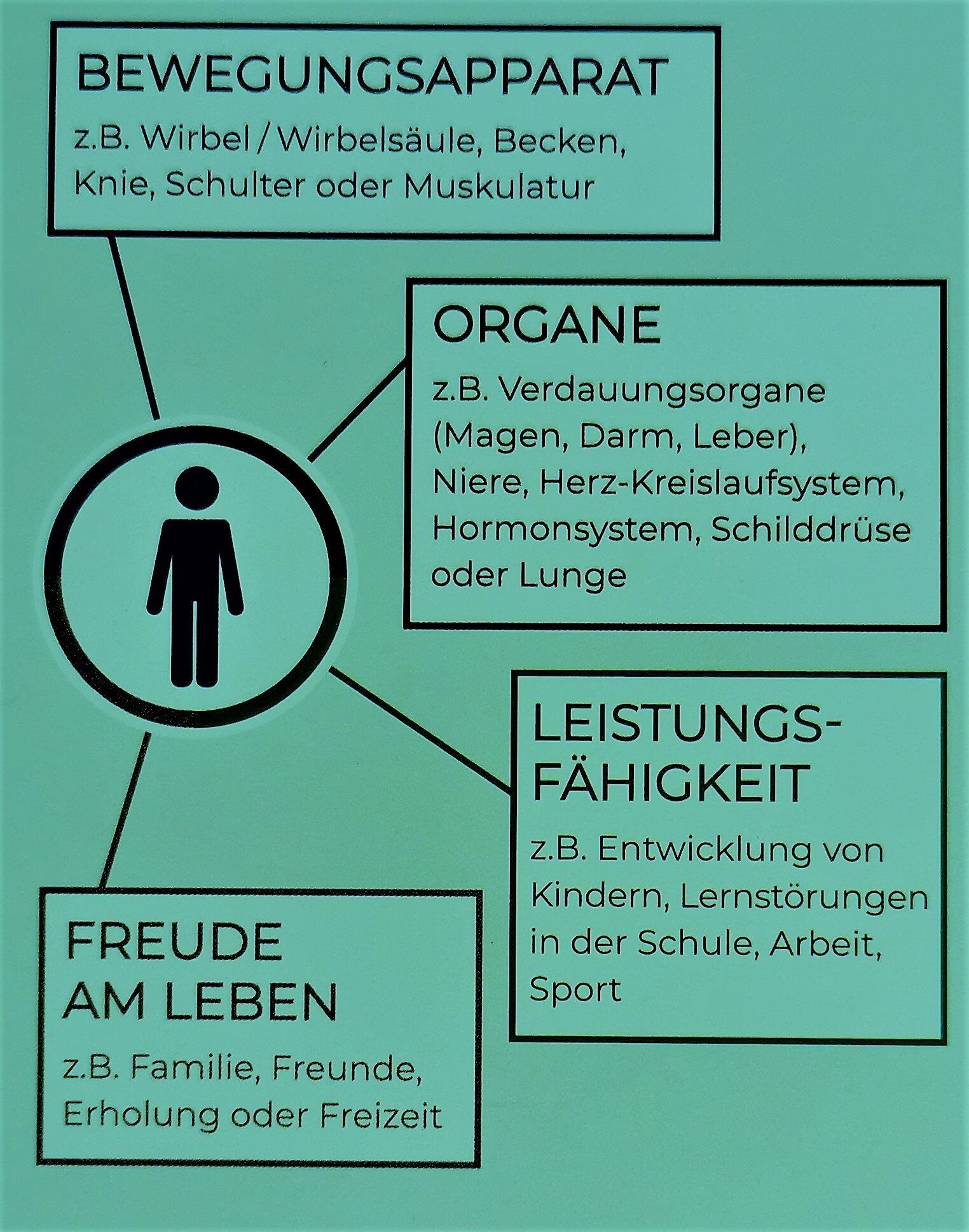 Je weniger Energie und Kraft der Mensch für körperliche Dysbalancen am Bewegungsapparat, im Organsystem oder in anderen Bereichen aufwenden muss, desto besser ist sein Wohlbefinden.
